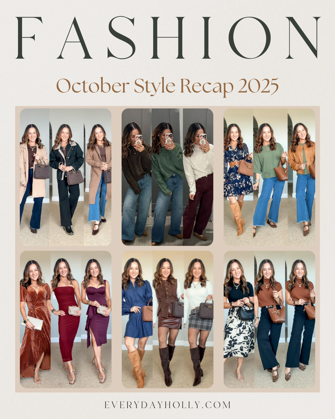 October was all about cozy layers, rich textures, and those chic outfits that make getting dressed effortless. From neutral staples to a few fun pops of color, this month’s looks blended comfort with style. These are the kind of pieces that work just as well for everyday errands as they do for a dinner out. Here’s a roundup of everything I’ve been loving (and actually wearing) so far this fall!