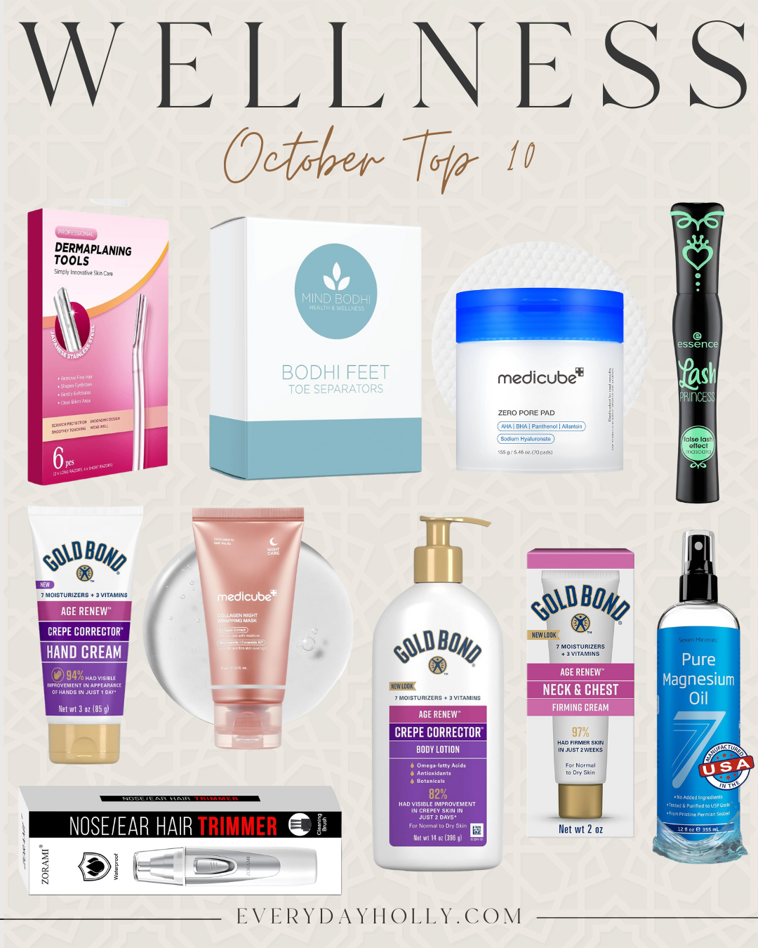 Dermaplaning Razors | Toe Separators | Medicube Pore Pads | Mascara | Gold Bond Hand Cream | Medicube Collagen Mask | Gold Bond Body Lotion | Gold Bond Neck & Chest Cream | Magnesium Oil | Nose/Ear Hair Trimmer