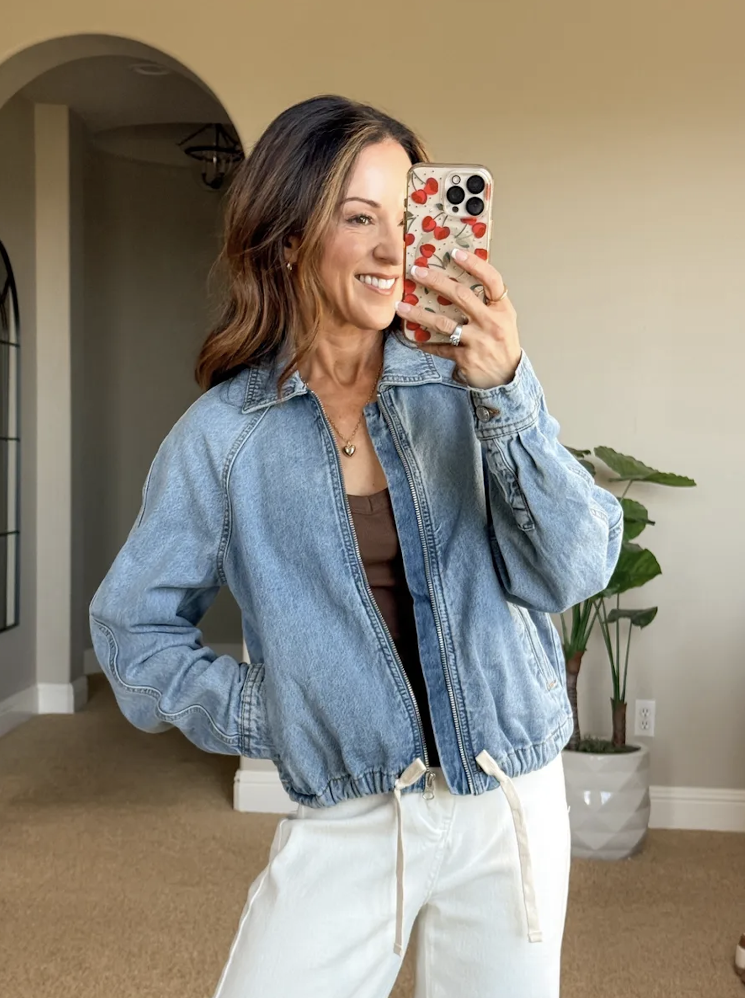 Bomber Denim Jacket | Button Down Shirt | Tank Top | Utility Button Down Shirt | Mary Jane Espadrille Flat | Adidas Sneakers | Tie Waist Neutral Jeans | Tie Waist Soft Jeans | Wide Leg Jeans | Grey Jeans | Linen Pants